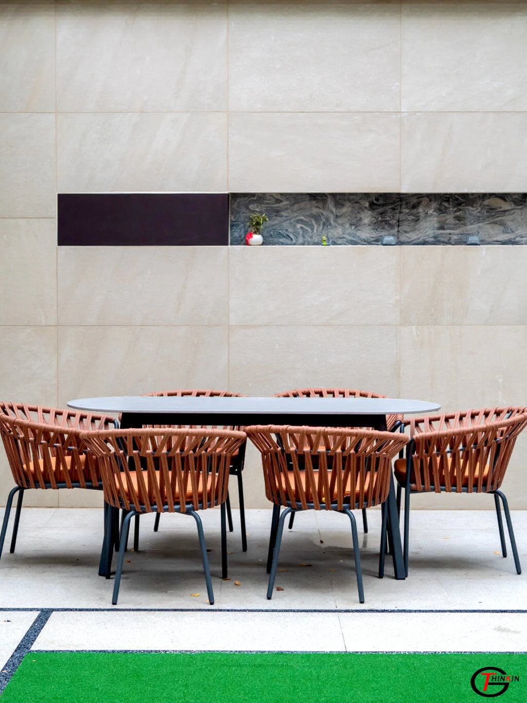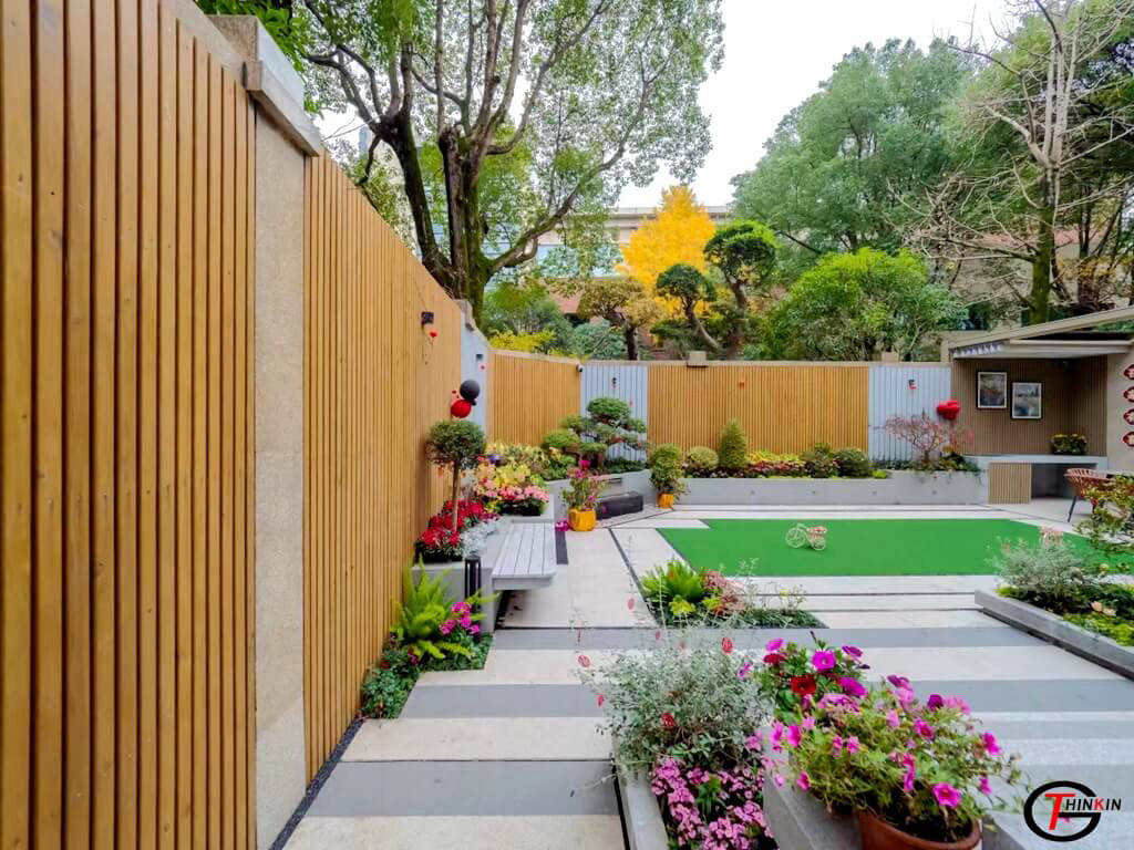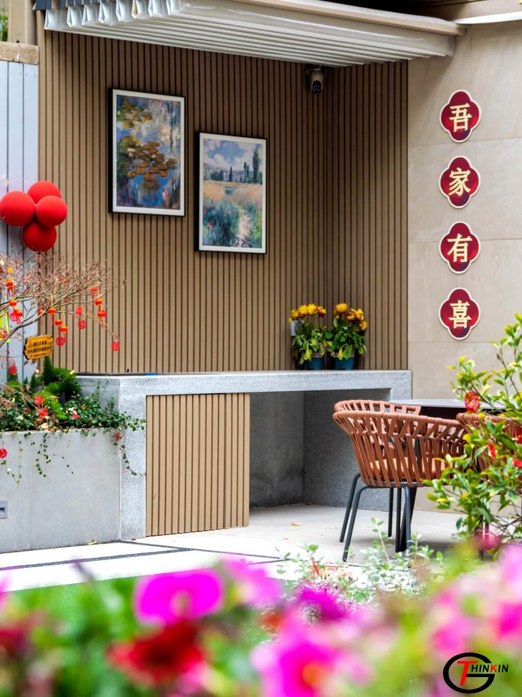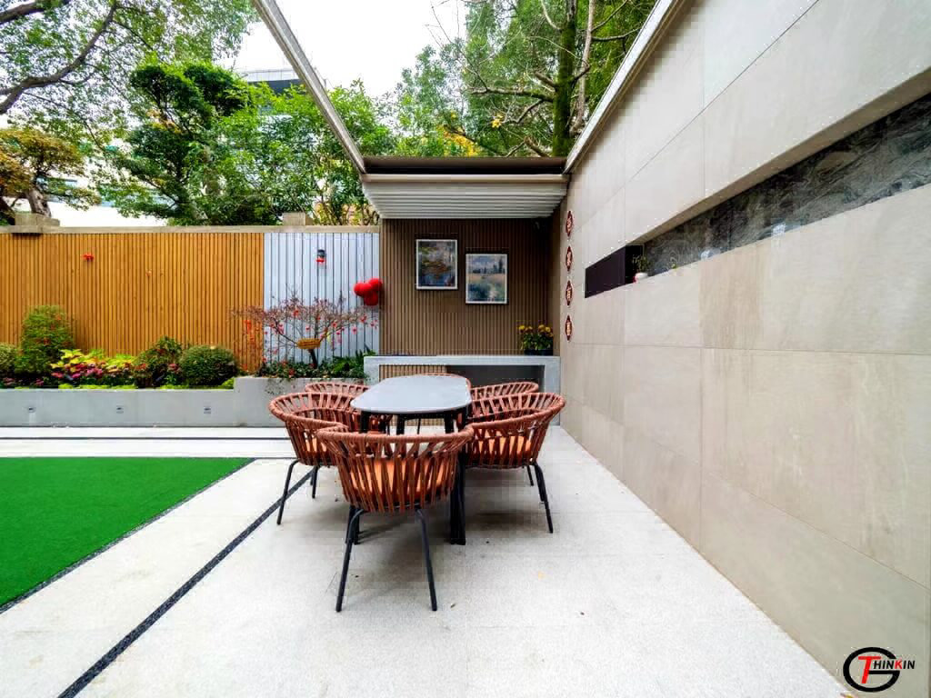 庭院右侧设置的户外就餐区,衔接着室内外的空间。在以长城板与花岗岩、耐候钢板为主的背景墙前,摆放桌椅。所有与亲朋好友欢聚的时光,都会在这里被记录下来。桌椅的一侧,以长城板背景上,装饰着两幅优美的画作;桌椅的另一侧,有优美山水纹理为背景的壁龛;而桌椅的上方,安装了电动遮阳棚,这一片精心设计的景色,阳光热烈,也无碍欣赏。