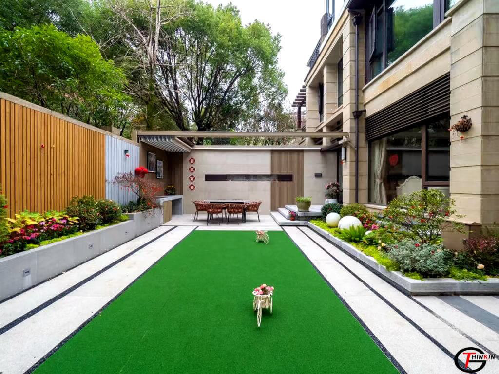 边欣赏着庭院花草,边进入庭院的核心地带。石质铺装成规则边框,边框内是一大块草坪。大片的绿色令人悦目,亦方便所有需要舒展身心的运动。绿色的草地,无时无刻不与两侧的花境呼应着,眼中是层次分明的景,心中是生动温暖的情绪。