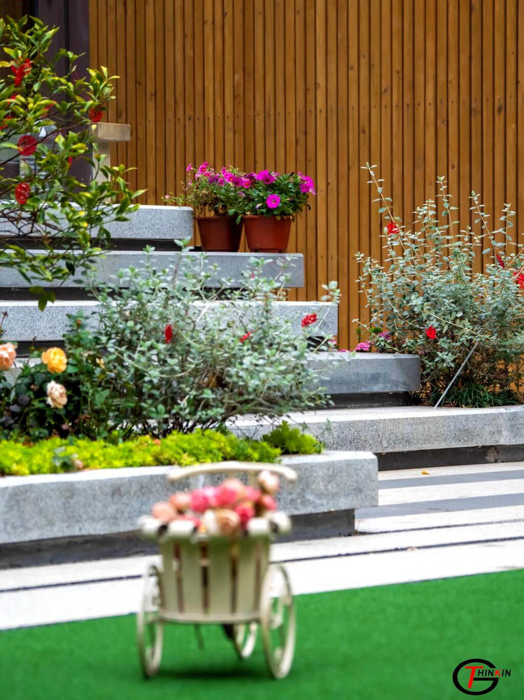 入户阶梯上,也装点了各种植物。阶梯自身的高低错落,增加了植物的欣赏性,同时植物也弱化了硬质台阶的边界感。“走花路”是多么美好的寓意,在这一方庭院内,每天都可以拥有。