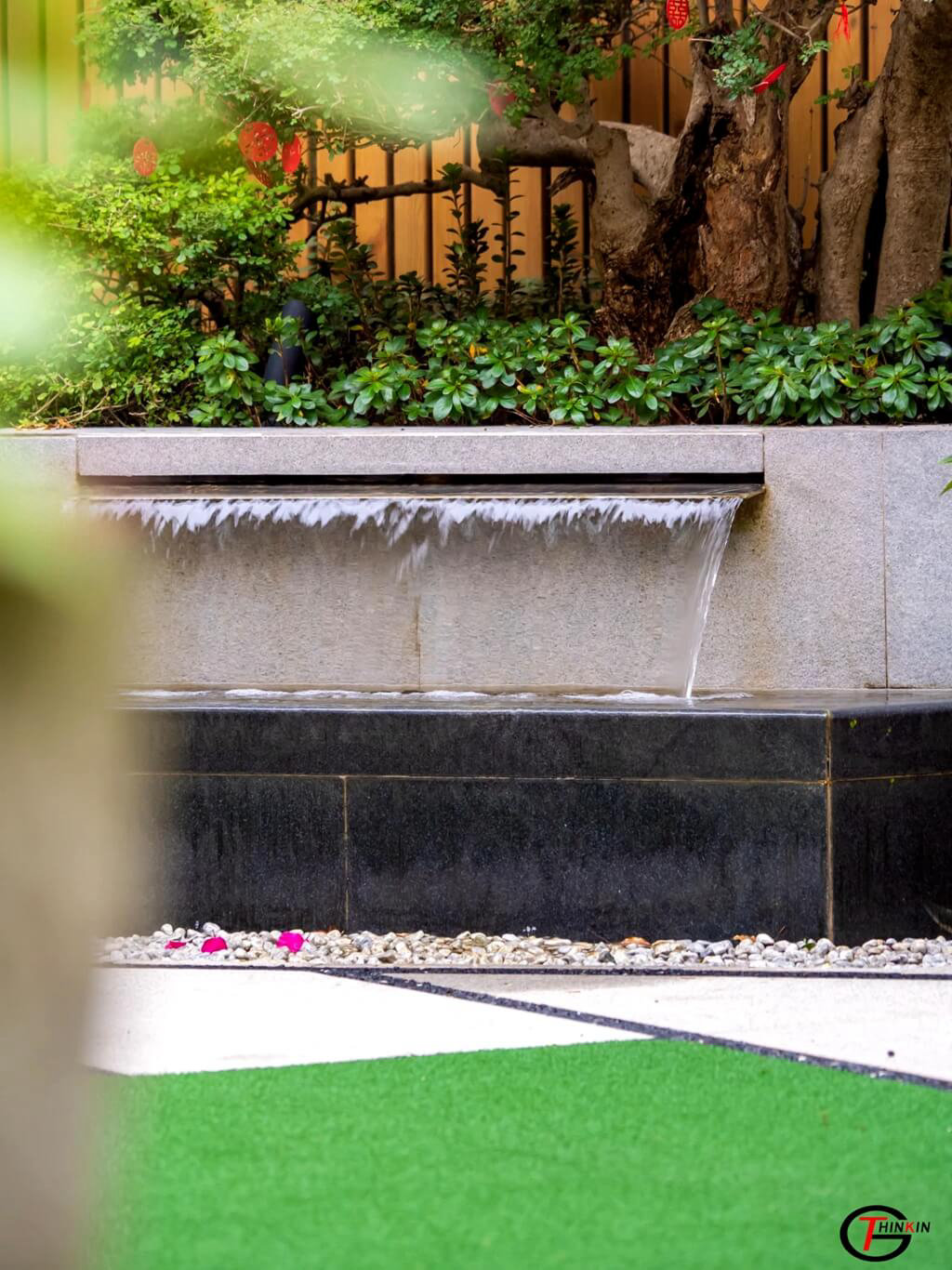 庭院的西南侧,流水潺潺。水景是庭院的灵魂,生命如水,方能源源不断。动静相宜,有了这叠水,整个庭院就活了起来,也净化了整个都市的忙碌。